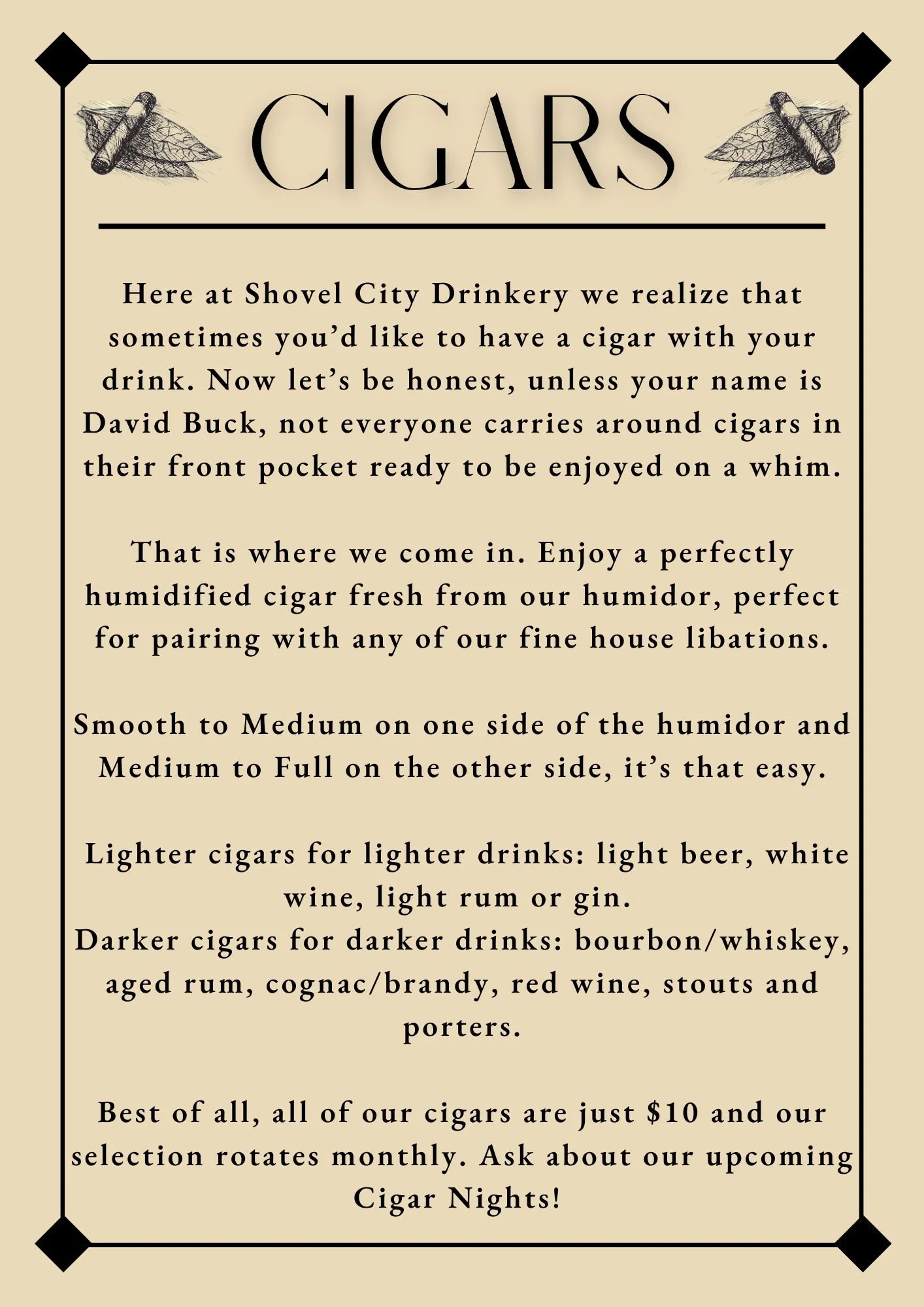 Cigars can be smoked on premise, in designated covered outdoor areas.